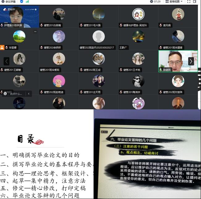 11月3日晚,学校健康与护理系邀请牡丹江医学院卫生管理学院院长郭继民教授,为健康服务与管理专业学生开展线上论文写作讲座。健康与护理系教学副主任张林琳主持,健康服务与管理专业负责人毕茎娜及全体专业教师、健管专业2020级60余人参加。讲座中,郭继民教授首先强调了论文写作在现代教育体系中的重要性,并分享了他多年来指导学生撰写高质量论文的宝贵经验。随后,郭教授围绕论文选题、取材、构思、起草、修订及答辩技巧等进...