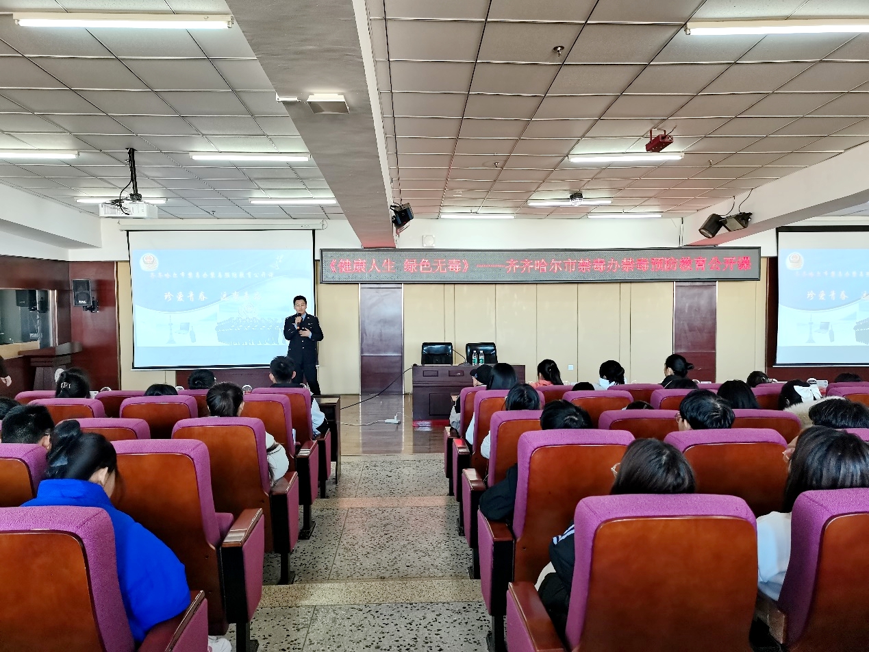 11月3日下午,学校团委于图书馆501报告厅开展“健康人生、绿色无毒——禁毒预防教育公开课”。本次活动特邀齐齐哈尔市公安局禁毒支队大队长于振东为学校学生开展讲座。活动通过到梦空间报名参与,共计300名同学参加。本次活动旨为增强学生拒毒、防毒意识和自觉抵制毒品侵害的能力,充分发挥学校在青少年毒品预防教育中的主阵地作用,强化校园禁毒安全防线,营造“绿色无毒”的健康校园成长环境。于振东警官向学生展示了一些常见...