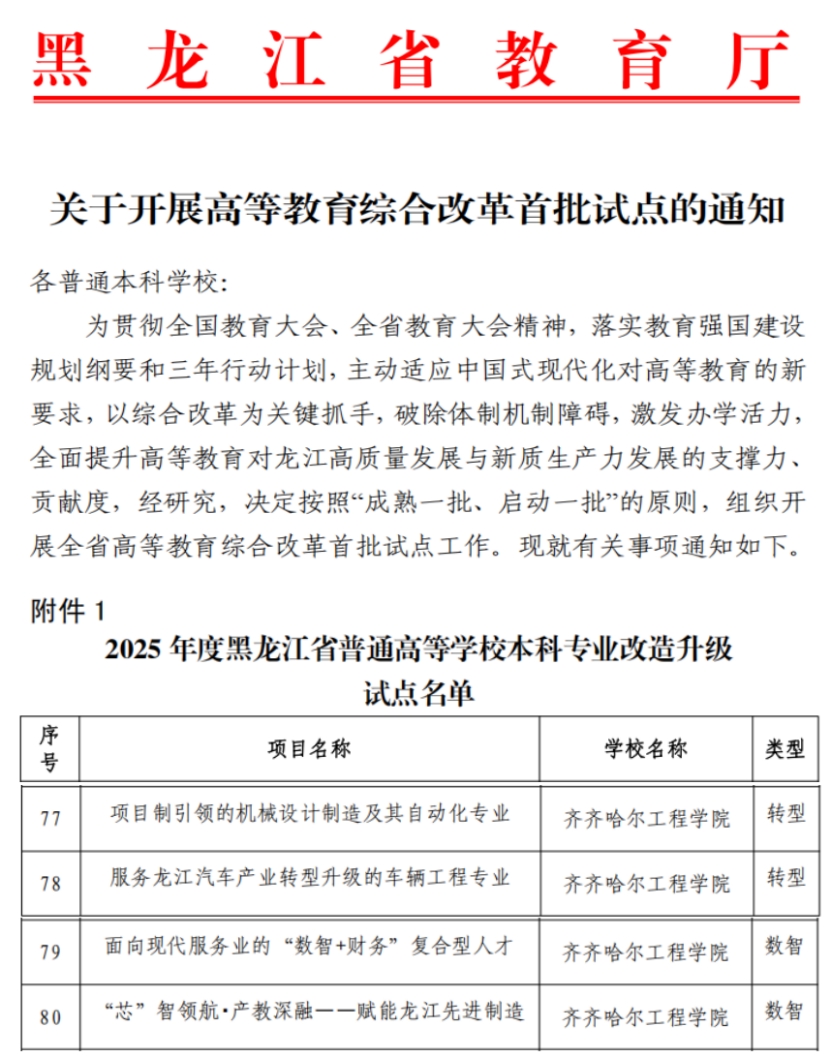 近日,省教育厅公布《关于开展高等教育综合改革首批试点的通知》,学校申报的4项本科专业改造升级试点成功获批。这一佳绩充分彰显了学校在本科教育教学改革以及产教融合发展领域的显著成效,更是学校积极推进内涵建设、服务龙江区域发展所取得的重要突破。 此次获批的2025年度黑龙江省普通高等学校本科专业改造升级试点共4项,具体涵盖:“项目制引领的机械设计制造及其自动化专业”试点,“服务龙江汽车产业转型升级的车辆...