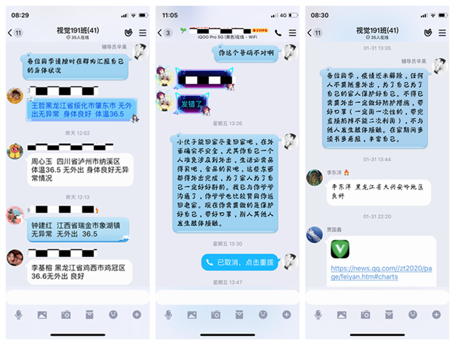 在新冠肺炎疫情防控工作中,学校各系辅导员老师以高度的责任感,积极按照学校疫情防控工作部署,利用电脑、手机在家网络办公,通过班级QQ群、微信群、微博等渠道传达学校要求,宣传相关防疫知识,切实落实“日报告、零...