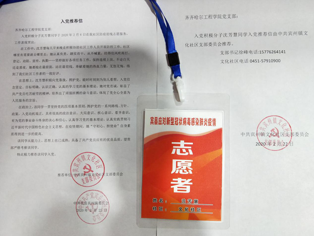 在新冠肺炎疫情防控工作中,健康护理与食品专业学生党支部入党积极分子沈芳慧同学,积极响应学校党委关于开展“抗‘疫’征途 党旗飘飘”活动和家庭所在宾县宾州镇文化社区党支部号召,报名作为志愿者协助社区工作人员...