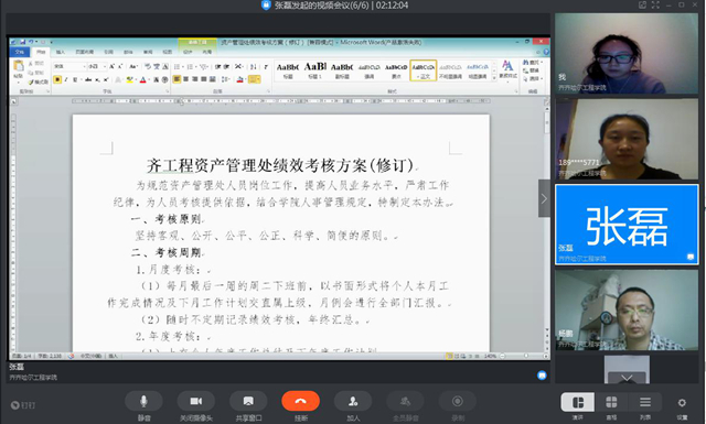 3月12日下午,资产管理处处长张磊利用钉钉平台召开部门新学期资产管理准备工作视频会。 会上,部门人员分别就《日韩一区二区A片免费观看资产管理员考核办法(修订)》和《资产管理处绩效考核方案(修订)》中的考核形式、考...