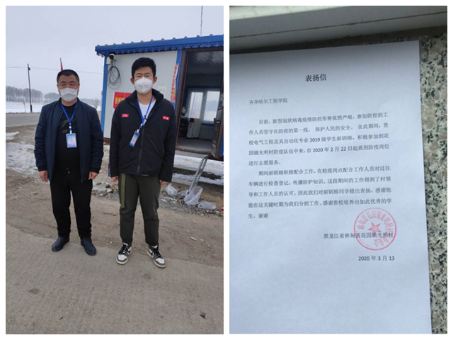 3月13日,机电工程系收到林甸县花园镇光明村的一封感谢信,信中表扬电气192班郝钥榕同学在疫情防控中配合村里工作,感谢学校培养这样的优秀学生。 郝钥榕同学在春节后,得知村里招募疫情防控志愿者,便主动了报名。从...