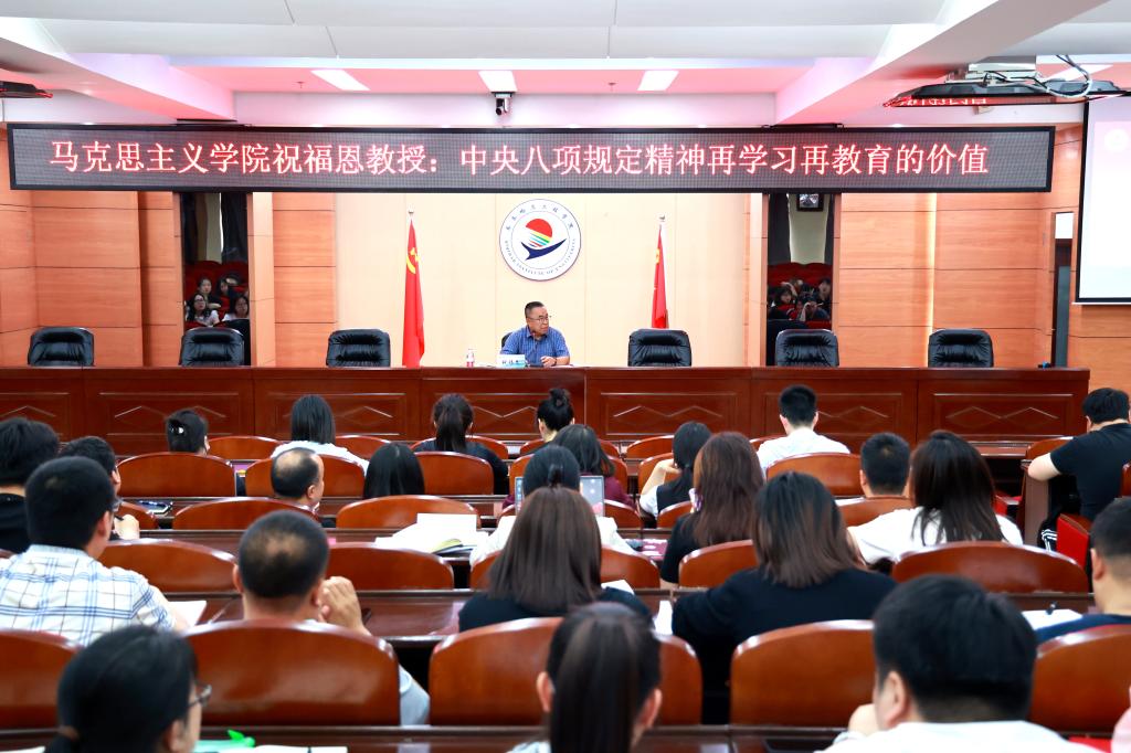 为深入贯彻中央八项规定精神学习教育,推动学习教育走深走实,6月7日,学校马克思主义学院特聘顾问祝福恩教授在图书馆601报告厅作“中央八项规定精神再学习再教育的价值”专题报告。学校各级领导干部、骨干学习班成员及其他党务干部,包括新提任干部、年轻干部、关键岗位、重点岗位干部参加会议。学校办公室主任王鑫主持。报告会上,祝福恩教授从全面从严治党的时代要求出发,详细阐释了中央八项规定是新时代党建的“开局破题”...